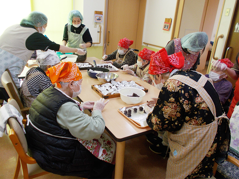 グループホームでは、認知症の方々が日常生活を共にされています。皆様それぞれの症状がある中で、その人らしく活き活きと過ごせるよう、日々の関わりを大切にしています。家事や洗濯、お庭の草花の手入れなどを一緒にしたり、季節ごとの行事や日課の体操、楽しんでいただけるレクリエーションなどをしながら、健康で楽しい毎日となるよう支援しています。